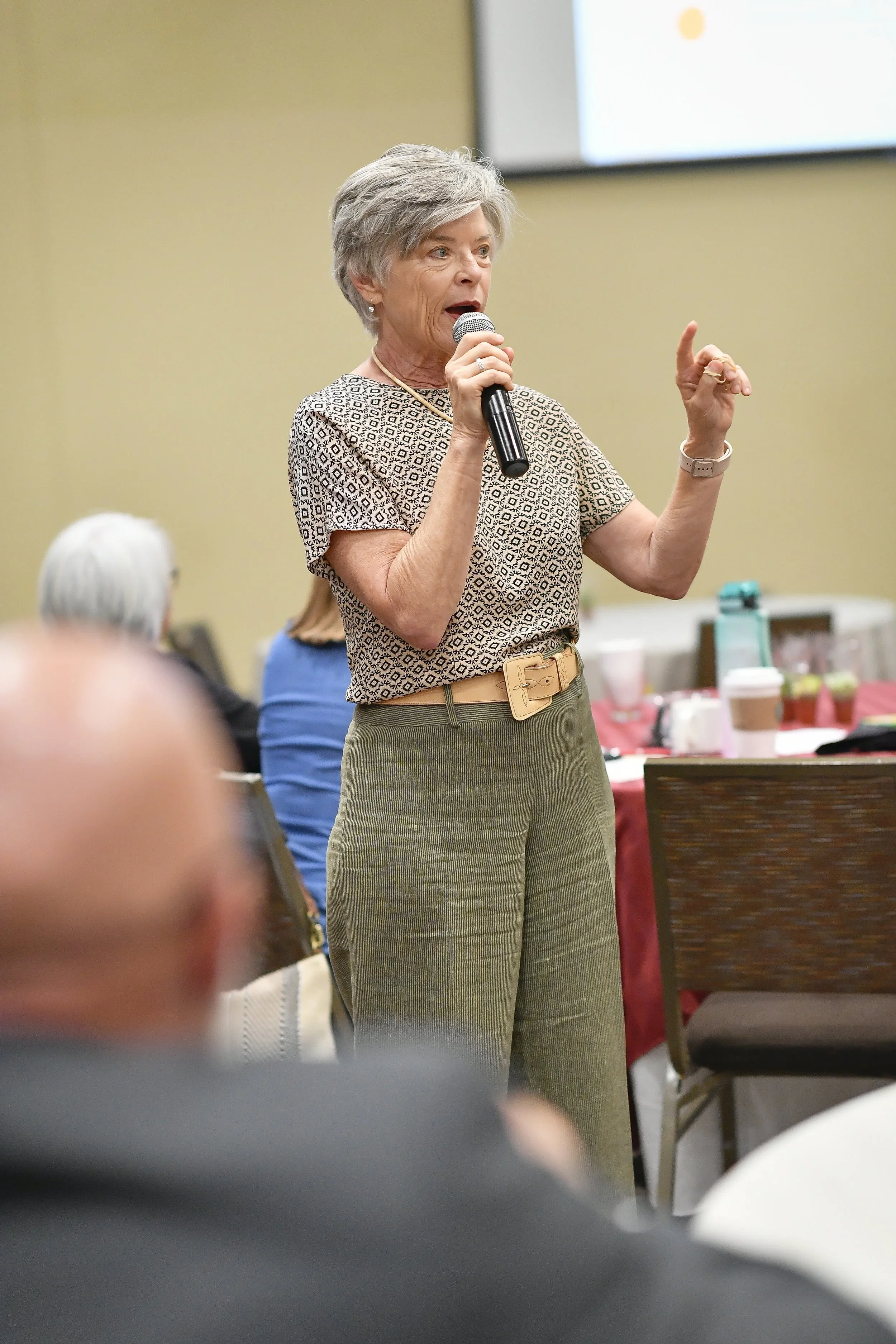 A woman with curly hair, glasses, and hoop earrings speaking into a microphone on stage, with a large screen to her left displaying a presentation.
